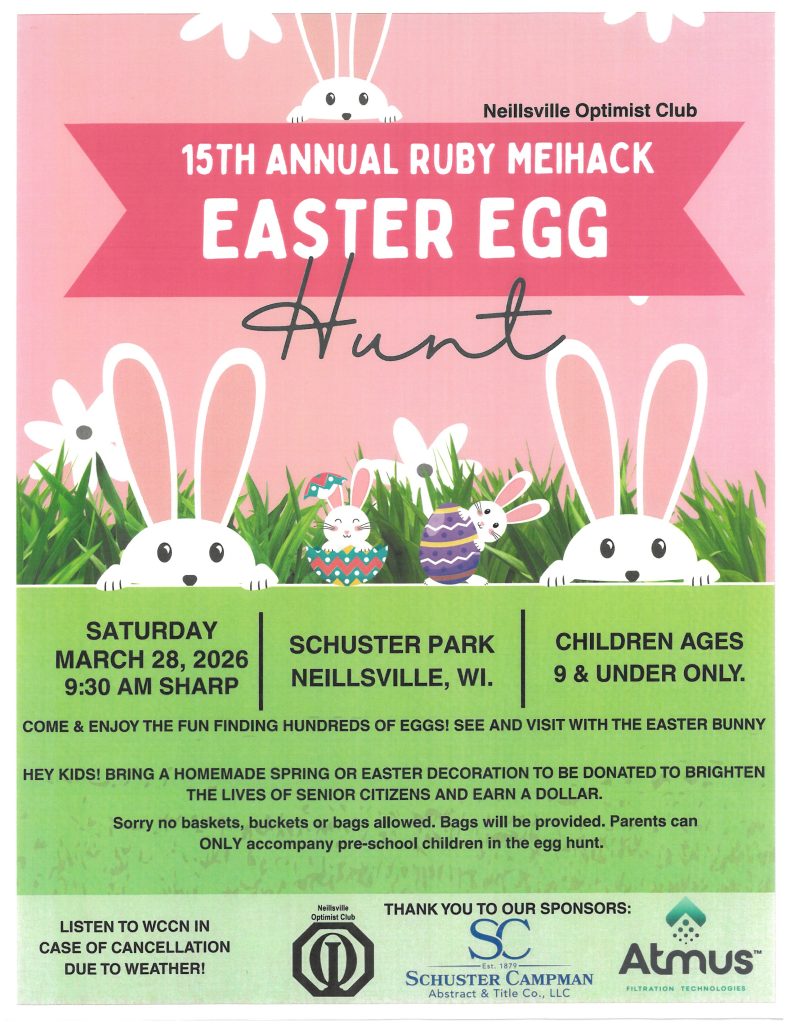 Posted on March 15, 2026, Edited March 12, 2026 by Michelle Grap EASTER EGG HUNT EASTER EGG HUNT SATURDAY, MARCH 28, 2026 STARTS AT 9:30 AM SCHUSTER PARK – AGES 9 YRS & UNDER ONLY
