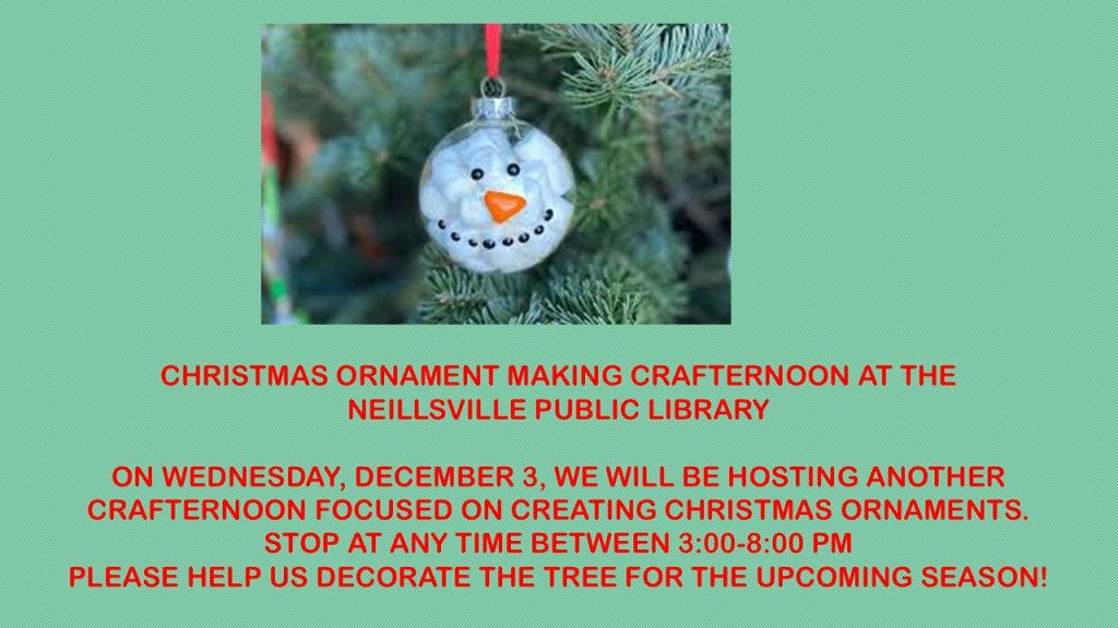 Posted on November 24, 2025, Edited November 20, 2025 by Michelle Grap NEILLSVILLE PUBLIC LIBRARY – CRAFTERNOON EVENT