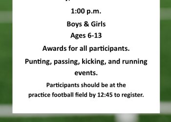 FOOTBALL OLYMPICS Posted on October 5, 2025 FRIDAY, OCTOBER 10TH BOYS & GIRLS AGES 6-13 1:00 PM PRACTICE FOOTBALL FIELD PUNTING, PASSING,…