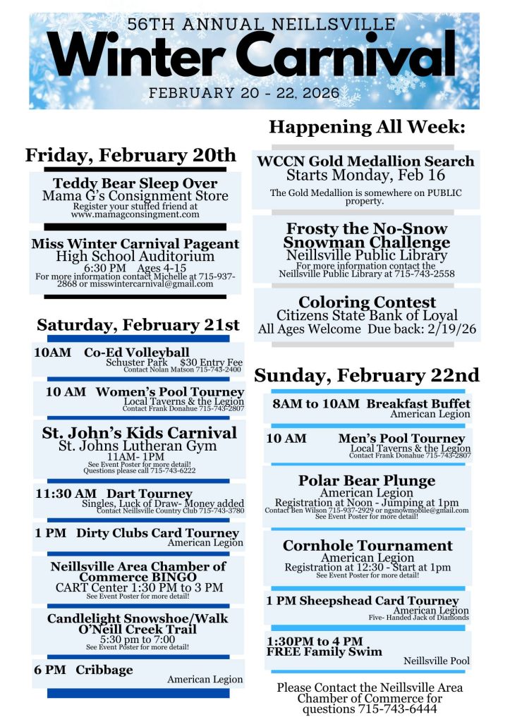 Posted on February 9, 2026, Edited February 2, 2026 by Admin Winter Carnival 2026 Neillsville Winter Carnival February 20th – February 22nd